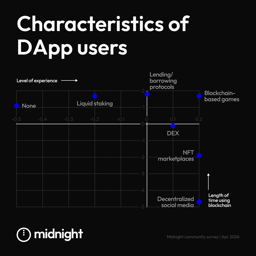 Alongside the launch of the Midnight network, the Midnight Foundation is sharing these community survey results to support developers in understanding user interest and behavior. Using a data-driven approach to designing applications can help developers to differentiate their applications using programmable privacy, utility and user experience.