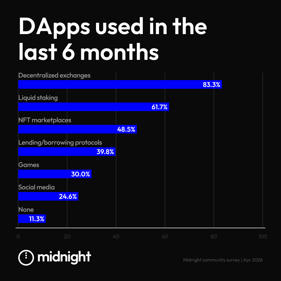 The data shows that most Midnight community members are familiar with decentralized finance (DeFi), particularly through decentralized exchanges and liquid staking. These are areas where privacy is a fundamental requirement rather than a secondary feature.
