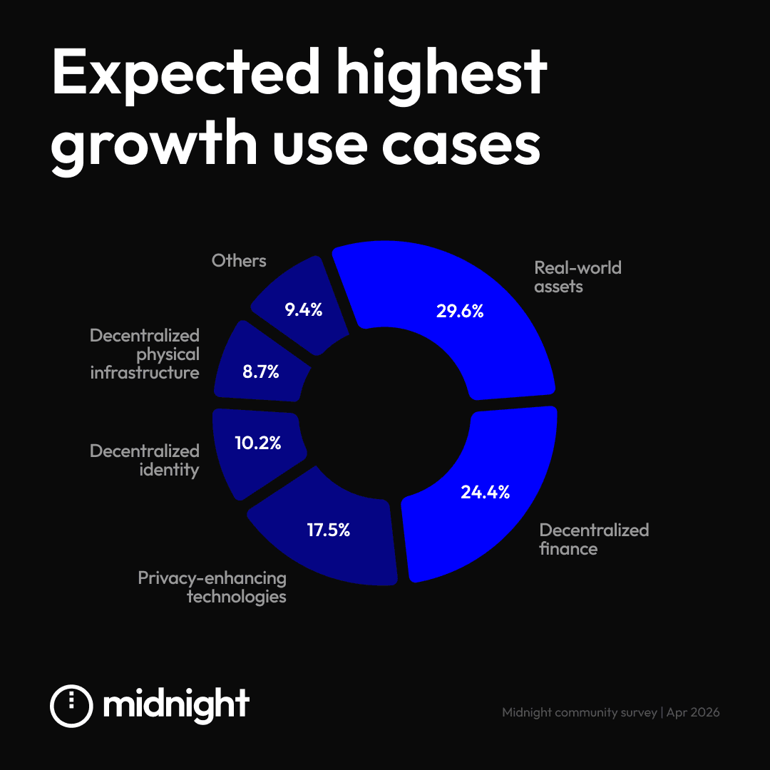 The community identifies significant potential for Midnight to address current industry needs. When asked which areas would see the most growth, respondents focused heavily on real-world assets (RWAs), DeFi and privacy.